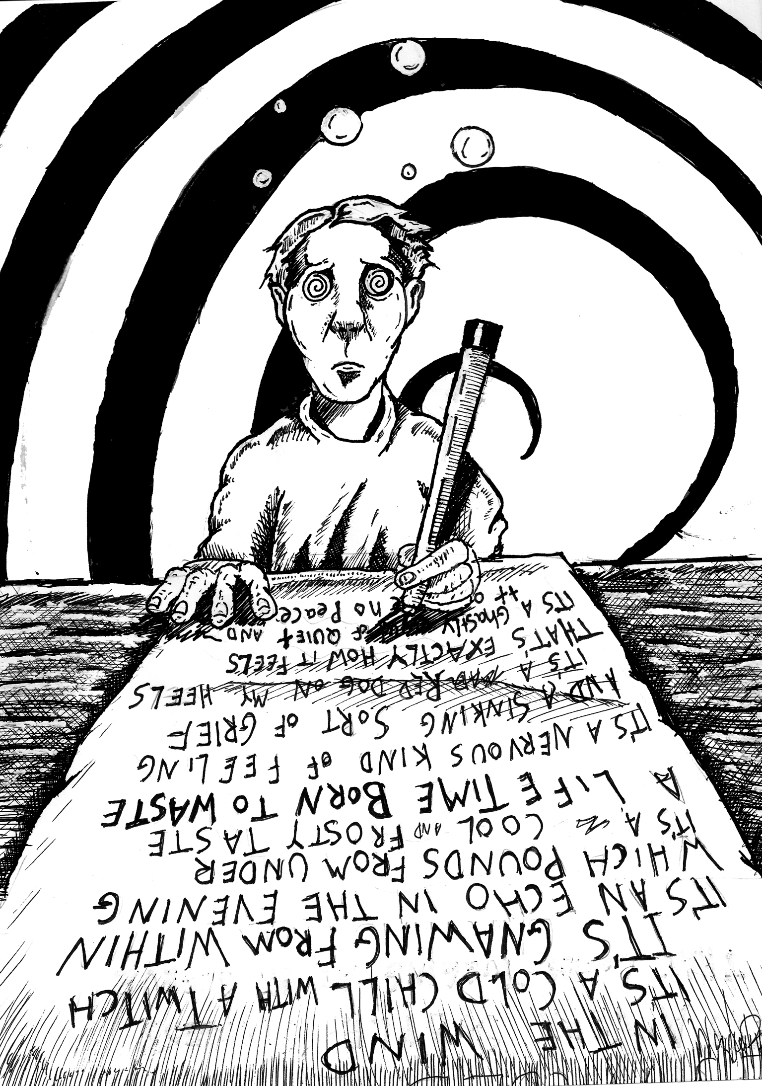 Somewhat astounded that the words on the hotel letterhead were there, I reread them and smiled. Larry knocked twice (our signal) and opened the door. “I’ll be back down in a few minutes, just take a longer break, “he said. That was fine with me. Once he left, though, the feeling of the LSD still coursed through me, making my fingers tremble. My body felt strange. I could feel my pores. Most of all, I felt the drug in my stomach. A cigarette smoker at the time, I coughed to clear some phlegm from my throat. It was not a healthy feeling. It felt like there was a lunger, or a tumor on my lung. It gave me the creeps. Along with the creeps, more words came to me. I grabbed another piece of paper and sat down at the table and the words spilled out again, just like before, with no thought involved. I wrote…