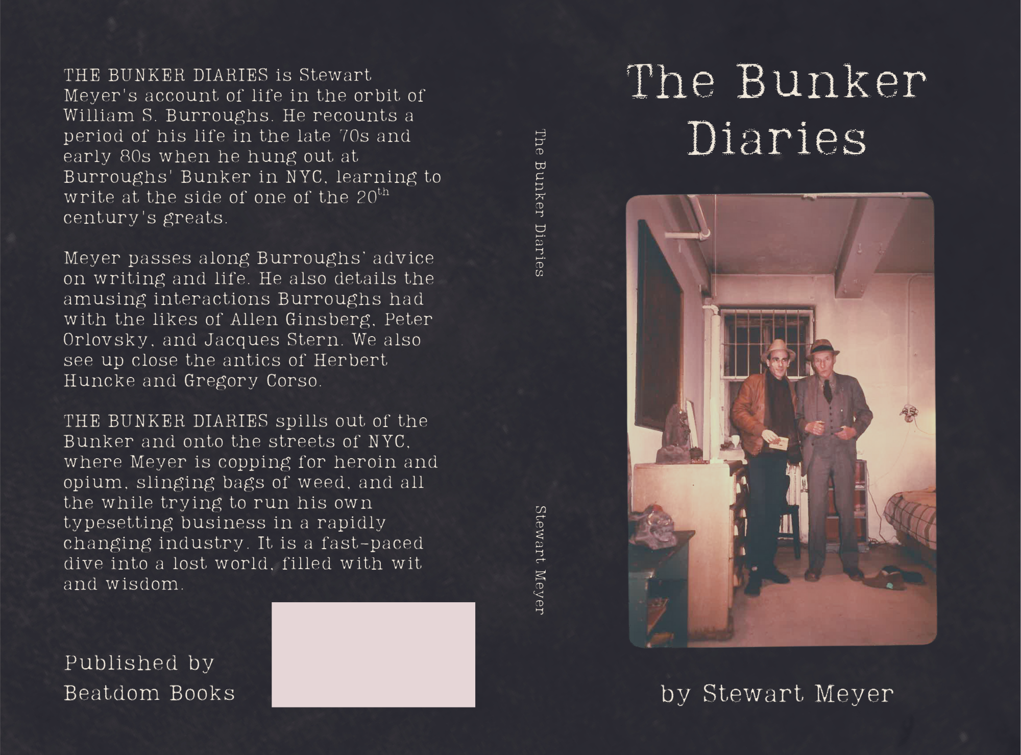 The Bunker Diaries is Stewart Meyer’s account of life in the orbit of William S. Burroughs. He recounts a period of his life in the late 1970s and early 1980s when he hung out at Burroughs’ Bunker in NYC, learning to write at the side of one of the 20th century’s greats.