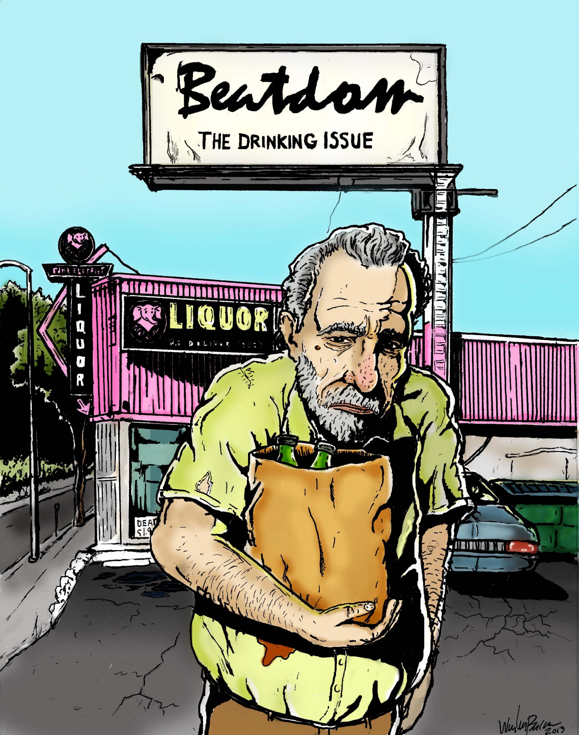 This is the cover for Beatdom #13: the DRINKING issue. It features legendary booze-hound, Charles Bukowski, as drawn by the talented Waylon Bacon.