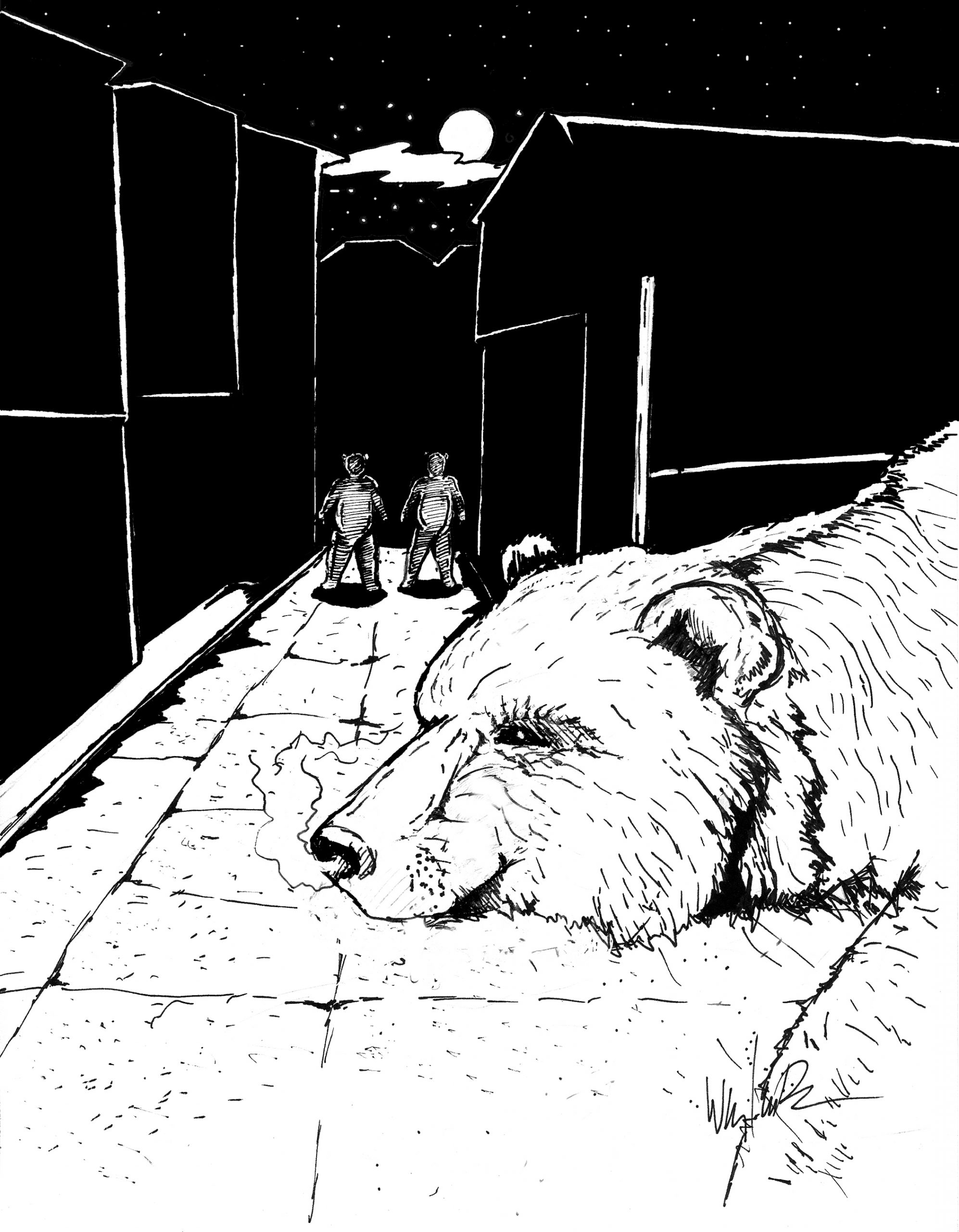 “Go ahead,” she said, feeling her voice resonate within her skinny chest, the words tingling like a kiss on her lips. Her eyes filled with warm tears. The bear put its head down and sighed as it relaxed its body. It’s shoulders, belly and hips stretched out across the floor like a range of rolling hills undulating across the horizon. Christine reached out and touched the bear’s chest. Her fingers worked their way down through the coarse outer guard hairs, finding the body heat trapped in the soft, dense undercoat. The feeling swept through her whole body, and she realized she was in love, that for the first time in her life she was completely at home in the world. “I will love you forever,” she said to the bear, who relaxed under her touch like a landscape caressed by the spreading rays of a rising moon.